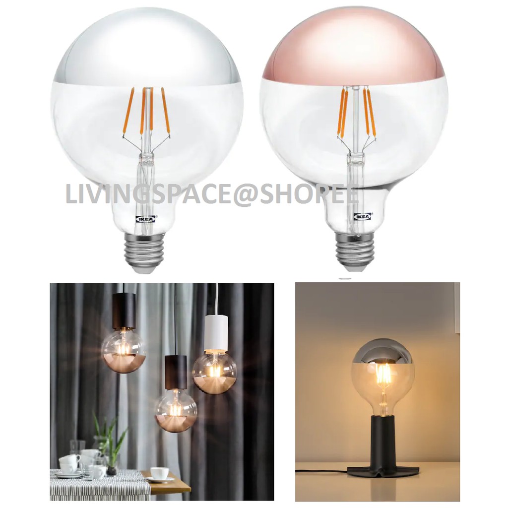 Ikea sillbo led bulb e27 370 lumen globe mirrored top rosé gold coloured the reflective top reduces the risk of glare so the light bulb is perfect for activities where you need a glare free bulb. The led light source consumes up to 85 less energy and lasts 10.